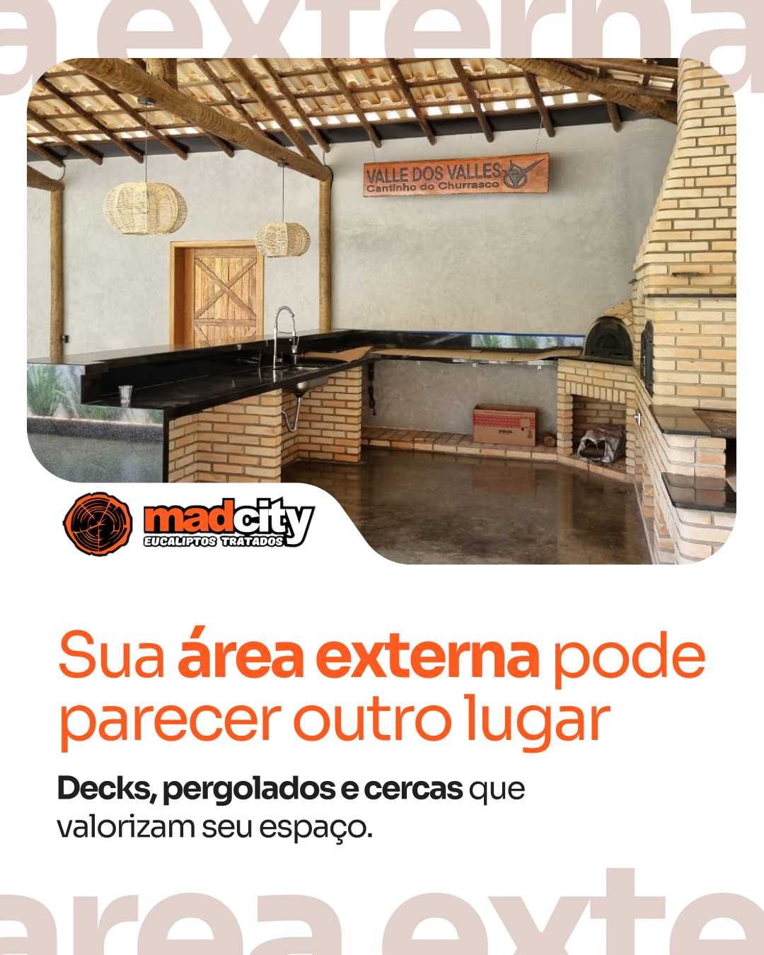 Na MadCity, oferecemos madeira de eucalipto tratada com excelência, ideal para cercas, decks, pergolados, playgrounds e muito mais. Com mais de 6 anos de experiência, somos referência em Artur Nogueira e região, comprometidos com a sustentabilidade e a entrega de produtos que aliam resistência, durabilidade e ótimo custo-benefício.